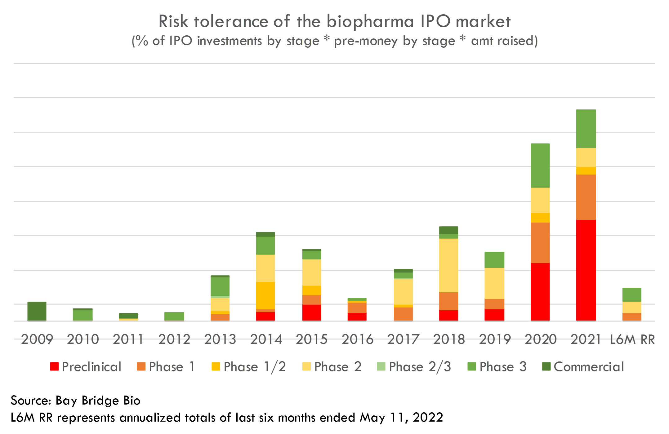 3 This is calculated by multiplying the % of IPOs in each development stage by the average pre-money valuation of IPOs at each stage, and then adjusting that figure by the year's overall IPO volume. This metric may understate risk tolerance because we don't quantify the difference in risk between companies of different stages (we just highlight different stages in different colors).